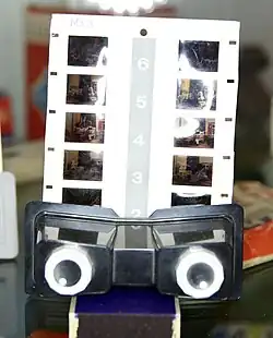 Вторая волна увлечения стереоскопами началась в конце 1930-х годов после распространения цветной обращаемой плёнки. Недорогие устройства из пластмассы или картона позволяли получать высококачественное объёмное изображение с малоформатных слайдов. Наиболее популярными в США и Западной Европе к середине XX века стали американские стереоскопы «View-Master», снабжавшиеся картонными дисками с семью стереопарами, сделанными на плёнке Kodachrome. Кроме дисков фабричного производства стереоскоп годился для рассматривания стереопар, отснятых самостоятельно фотоаппаратами View-Master Personal Stereo Camera. В СССР в продаже были доступны стереоскопы производства ГДР, выполненные в виде детской игрушки[13]. В комплекте поставлялись прямоугольные картонные рамки с цветными стереопарами кукольных сказочных сюжетов[14].