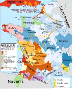 Воспользовавшись передышкой, король французов Карл V реорганизовал армию и провёл экономические реформы. Это позволило французам на втором этапе войны, в 1370-х годах, добиться значительных военных успехов. Англичане были вытеснены из страны. Несмотря на то, что война за бретонское наследство закончилась победой англичан в битве при Оре, бретонские герцоги проявляли лояльность по отношению к французским властям, а бретонский рыцарь Бертран Дюгеклен даже стал коннетаблем Франции. В это же время Чёрный Принц с 1366 года был занят войной на Иберийском полуострове, а Эдуард III был слишком стар, чтобы командовать войсками. Всё это благоприятствовало Франции. Педро I Кастильский, чьи дочери Констанция и Изабелла были замужем за братьями Чёрного Принца Джоном Гонтом и Эдмундом Лэнгли, был смещён с трона в 1370 году Энрике II Кастильским при поддержке французов под командованием Дюгеклена. Разгорелась война между Кастилией и Францией, с одной стороны, и Португалией и Англией — с другой. С гибелью сэра Джона Чандоса, сенешаля Пуату, и пленением капталя де Бюша Англия лишилась в их лице своих лучших военачальников. Дюгеклен, следуя осторожной «фабианской» стратегии, в серии кампаний, избегая столкновений с крупными английскими армиями, освободил множество городов, таких, как Пуатье (1372) и Бержерак (1377). Союзный франко-кастильский флот одержал уверенную победу при Ла-Рошели, уничтожив английскую эскадру. Со своей стороны, английское командование предприняло серию разрушительных грабительских рейдов, однако Дюгеклен вновь сумел избежать столкновений.