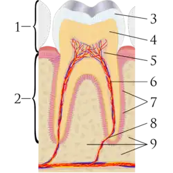 Сагиттальный разрез коренного зуба; 1: коронка, 2: корень, 3: эмаль, 4: дентин и дентинные канальцы, 5: камера пульпы, 6: кровеносные сосуды и нерв, 7: периодонтальная связка, 8: верхушка и периапикальная область, 9: альвеолярная кость