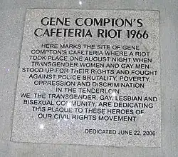 Первые открытые стычки ЛГБТ-людей с полицией были отмечены ещё в 1959 году[26]. В 1966 году полиция прибыла в Кафе Комптона, чтобы арестовать мужчин за ношение одежды противоположного пола. Локальный конфликт очень быстро перерос в открытое противостояние с хозяевами кафе. Друзья арестованных устроили в кафе настоящий погром. В расход шло все: от тарелок и чашек, до зеркал и окон. На следующую ночь, когда хозяева кафе вставили разбитые окна и зеркала, погром повторился с ещё большей силой. Кафе было практически «стёрто с лица земли»[27] И так продолжалось до тех пор, пока арестованных не отпустили. Считается, что этот конфликт ознаменовал собой начало трансгендерного движения в Сан-Франциско[27].
