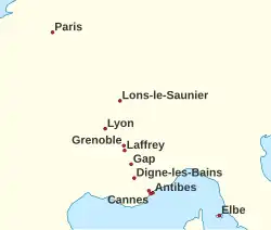 Канны и Грас признали власть Наполеона как вернувшегося императора без какой-либо попытки сопротивления. Пополнив запасы провианта в Каннах, оставив на берегу четыре орудия и распечатав листовки со своим воззванием в Грасе, Наполеон решил идти на север через провинцию Дофине. Не задерживаясь в таких городах, как Динь и Гап, 7 марта 1815 года он вышел на Гренобль, столицу провинции.
