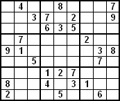 Середина верхнего ряда блоков 3×3 и середина нижнего ряда блоков 3×3 почти полностью заполнены. В середине верхнего блока три нерешённых числа — 1, 4, и 9. Анализируя такую ситуацию, можно вписать число 4 в центр блока, число 1 в правый верхний угол, а число 9 — в левый верхний угол. Аналогично можно поступить с нижним центральным блоком 3×3: в нём отсутствуют числа 6, 8 и 9. Ячейки заполняются последовательно: число 6 ставим в центр, число 9 в нижний правый угол, а число 8 в нижний левый угол.