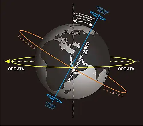 - Ось вращения Земли наклонена на угол 66°34′ к плоскости земной орбиты (см. Наклон оси вращения).