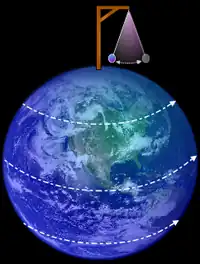 Маятник Фуко. Эксперимент, наглядно демонстрирующий вращение Земли, поставил в 1851 году французский физик Леон Фуко. Его смысл наиболее понятен в случае, если маятник закреплен на одном из полюсов Земли. Тогда его плоскость колебаний неизменна относительно инерциальной системы отсчёта, в данном случае относительно неподвижных звёзд. Таким образом, в системе отсчёта, связанной с Землей, плоскость колебаний маятника должна поворачиваться в сторону, противоположную направлению вращения Земли. С точки зрения неинерциальной системы отсчёта, связанной с Землёй, плоскость колебаний маятника Фуко поворачивается под действием силы Кориолиса[42].