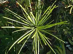 Растение примечательно своей хвоей, уникальной для представителей отдела Хвойные (Pinophyta): уплощённые иголки длиной до 15 см образуют ложные мутовки (по 10—30 в каждой) и раздвинуты в стороны подобно спицам зонтика; отсюда и общеупотребительное название этого дерева, имеющееся во многих языках, — «зонтичная сосна». В действительности эти иголки не являются настоящими листьями, а являются укороченными побегами, состоящими из очень короткого редуцированного стебля и двух сросшихся листьев (интересно, что эти листья срослись таким образом, что их морфологически верхняя сторона находится на нижней стороне этого двойного органа); растут же эти укороченные побеги из пазух других листьев, имеющих вид чешуек, прилагающих к стеблю.