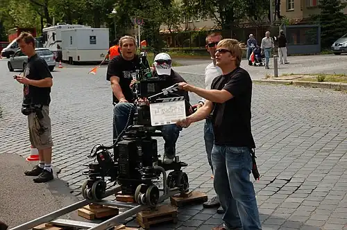 - Режиссёр-постановщик (англ. film director) — ключевой творческий руководитель, автор проекта, главное лицо на съёмочной площадке[4]. Режиссёр-постановщик интерпретирует сценарий и придаёт отдельным фрагментам кинофильма единство и законченность художественного произведения[5]. Руководит работой актёров и всех остальных участников съемочной группы (оператора, звукорежиссёра, художника-постановщика и др.).