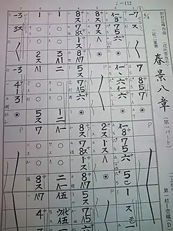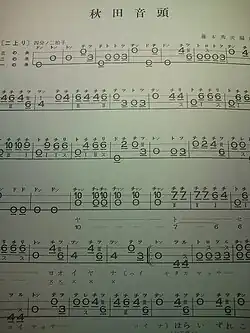 Ранние ноты для сямисэна изображают положение пальцев левой руки на грифе точками разной формы, либо, в нотации «ироха» (яп. いろは譜 ироха фу) — слогами каны, с указанием мелодических украшений[48][42]. Во время подъёма престижа инструмента в XX веке распространились две новые системы нотации на основе французской, с арабскими цифрами и обозначением тактов: названная в честь Ёсидзуми Косабуро «косабуро» (яп. 小三郎譜), где цифры означают высоту звука в диатоническом звукоряде, и «бунка» (яп. 文化譜), где ими записывают положение пальцев на грифе[48]. В жанре дзиута используется собственная одноимённая нотация (яп. 地唄譜 дзиута фу).