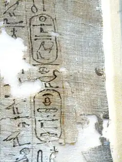 Фрагмент похоронных пелен царевны Яхмос на которых написано имя её отца, фараона Секененра Таа II. Египетский музей, Турин