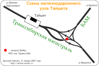 - ↑ Железная дорога Тайшет – Братск – Усть-Кут (западный участок Байкало-Амурской железнодорожной магистрали).