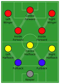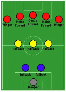 В 1883 году команда Кембриджского университета вышла на игру с двумя защитниками (англ. full-backs) и тремя хавбеками (англ. half-backs), перед которыми играло пять форвардов (англ. forwards) (схема 2-3-5). Крайние полузащитники во время обороны следили за флангами, а средний играл ближе к нападению и часто становился одним из самых результативных игроков (например, Дьёрдь Шароши). В этой схеме средний нападающий оттягивался немного назад, создавая простор для фланговых игроков. Такую схему и применяли большинство ведущих команд в начале XX века (до 1930-х годов).
