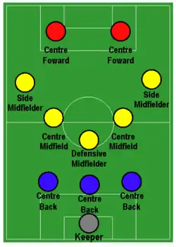 - 3 защитника. Правый защитник покрывает левого крайнего нападающего противника, левый — правого крайнего. Средний играет против центрфорварда.