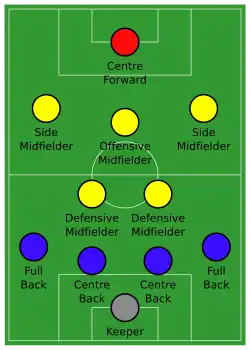 В этой схеме присутствуют четыре защитника, два опорных полузащитников, два атакующих полузащитников, которые играют как в центре, так и на флангах, и два нападающих.
