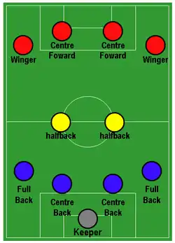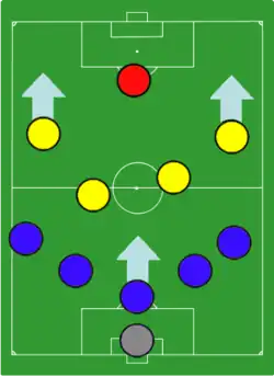 - Ближайшие к воротам противника — два крайних и средний нападающих. Задачи крайних: на скорости пройти флангом и дать пас среднему, который играет в штрафной площадке. Оборонительных функций практически не имели.