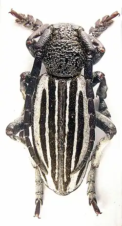Тело 13,5—18,5 мм в длину. Голова, грудь, и усы черные. Надкрылья белые с двумя чёрными полосами. Полоски на талии узкие, плечевые и боковые полоски широкие. Передняя часть груди голая и грубо расставленная[2].