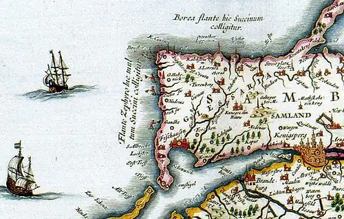 Гравёр: Николас Фишер Второй, картограф: Янсон Фисшер. Первоначальная основа — карта работы Каспара Хенненбергера (1529–1600), который поместил рядом надписи на латинском языке: «Когда дует западный ветер, здесь собирают много янтаря», «Когда дует северный ветер, здесь собирают янтарь» и изобразил фигурки ловцов янтаря с сачками[7].