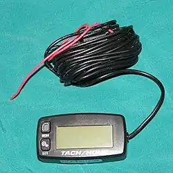 Тахометр электронный бесконтактный для лодочного мотора. Красный провод тахометра наматывается вокруг изоляции высоковольтного провода, идущего к свече зажигания. Прибор может работать как счётчик моточасов. Также пригоден и для других бензиновых двигателей.