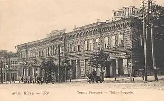 | «Соловцов»[3] | Театр Бергонье (до 1898), театр Соловцова | 1891 год — основан как Киевское драматическое товарищество 1919 год — национализирован советской властью и преобразован во Второй театр Украинской советской республики им. В. И. Ленина |