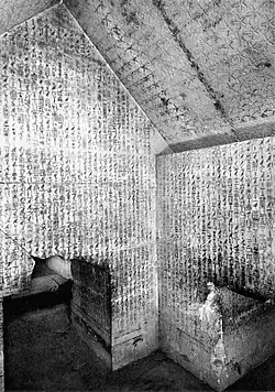 «Те́ксты пирами́д» — древнейшее произведение египетской религиозной и заупокойной литературы, дошедшее до нас[2]. Название они получили по месту своего нахождения: они покрывают стены внутренних помещений пирамид, расположенных в Саккара, некрополе фараонов Мемфиса, и построенных где-то между 2350 и 2175 гг. до н. э. В этих пирамидах были погребены: фараон Унис V династии (середина XXIV в. до н. э.) и четыре фараона VI династии — Тети, Пепи I, Меренра и Пепи II Неферкара (XXII в. до н. э.). Таким образом, пирамиды, содержащие Тексты, были воздвигнуты в течение полутора веков[3]. Сами тексты, скорее всего, старше пирамид и были созданы задолго до объединения Северного и Южного Египта (около 3000 г. до н. э.)[4].