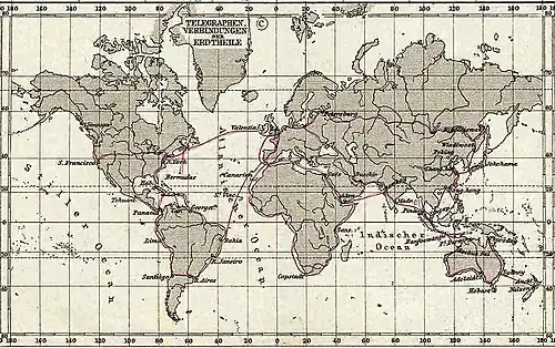 В 1858 году была установлена трансатлантическая телеграфная связь. Затем был проложен кабель в Африку, что позволило в 1870 году установить прямую телеграфную связь Лондон — Бомбей (через релейную станцию в Египте и на Мальте).