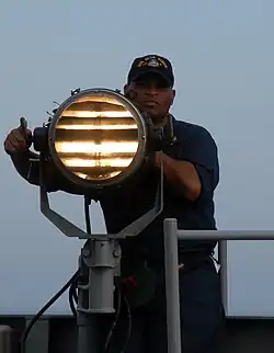 Передача сообщения кодом Морзе при помощи корабельного сигнального прожектора (лампы Олдиса)
