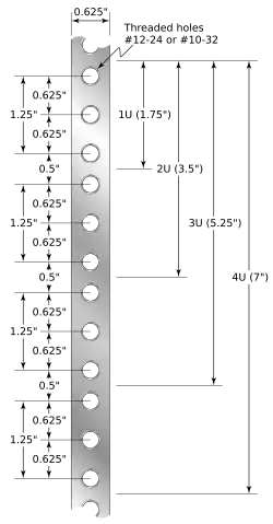 Крепёжные отверстия в стойке соответствуют крепёжным элементам на фронтальной плоскости монтируемого в стойку оборудования и располагаются на вертикальных элементах стойки с периодом в 1,75 дюйма (44,45 мм). Эта величина задаёт дискретность размера оборудования по высоте и образует единицу измерения, называемую стоечным юнитом («U»). Таким образом, для упорядочивания размещения оборудования в стойке предпочтительно использовать корпуса оборудования, которые имеют высоту, кратную целому числу юнитов.