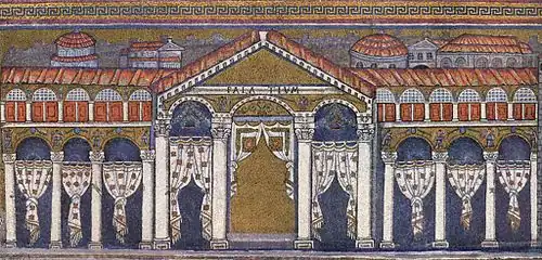 Памятники Рима, куда Теодорих в первый раз совершил торжественный въезд в 500 году, приводили его в восторг, и он объявил, что Вечный город всегда должен пользоваться особыми привилегиями. Теодорих много жертвовал на восстановление в Риме памятников древности, улучшил городское управление, относился с почтением к сенату, заботился о развлечении народа пышными играми в Колизее.[23] Столицей своей Теодорих, однако, избрал не Рим, а, по примеру последних императоров, хорошо укреплённую и чуждую воспоминаний о древней свободе — Равенну. Он блестяще украсил её и построил себе роскошный дворец, изображение которого сохранилось на мозаике одной из равеннских церквей, возведённой в его время и уцелевшей до наших дней. В Равенне Теодорих был окружён пышным двором; столица его сделалась не только центром интенсивной политической работы, но и средоточием главных умственных сил страны.