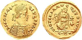 ![]() Золотая монета (тремисс) с изображением Теодориха Великого (сохранился один экземпляр). Национальный музей Рима. | |
