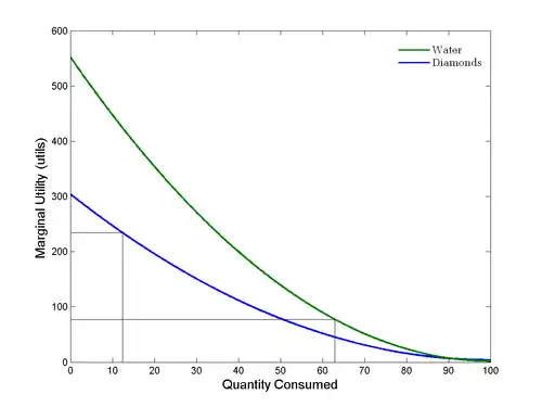 График показывает предельную полезность (измеряется в единицах полезности) алмазов и воды как функцию объёма потребления