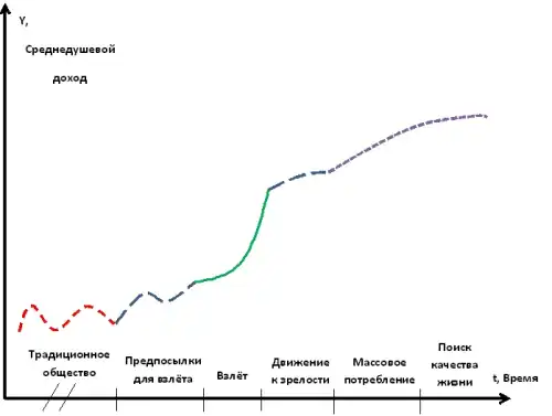 В 1956 году профессор Массачусетского технологического института У. Ростоу в своей статье «Взлёт к самоподдерживающемуся росту»[1] отметил концепцию перехода к «самоподдерживающемуся росту», обосновывая переход от традиционного общества к современному обществу. Развивая данную концепцию перехода в 1959 году, У. Ростоу сформулировал теорию стадий экономического роста в статье «Стадии экономического роста»[2], которая в 1963 году стала предметом обсуждения на конференции, организованной Международной экономической ассоциацией. В статье «Политика и стадии роста»[3] 1971 года У. Ростоу добавил шестую стадию роста[4].