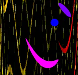 Пример топологического смешивания, где x → 4x(1 — x) и y → x + y, если x + y < 1 (иначе x + y — 1). Здесь синий регион в процессе развития был преобразован сначала в фиолетовый, потом в розовый и красный регионы и в конечном итоге выглядит как облако точек, разбросанных поперёк пространства