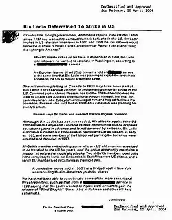 Ситуация с резюме от 6 августа 2001 года находится в центре многих дискуссий в разведывательном сообществе США. Этот документ имеет не только расплывчатый заголовок, но и столь же неясное содержание:
