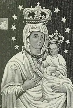 Поясной образ Богородицы с маленьким Иисусом на руках. Икона от 1920-х годов — в серебряном окладе (ризах), фигуры — коронованные [1].