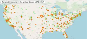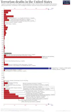 В докладе 2017 года, подготовленном Управлением государственной отчетности США, было установлено, что из 85 смертоносных экстремистских инцидентов, произошедших после 11 сентября 2001 года, ультраправые экстремистские группы несут ответственность за 73 %, а радикальные исламистские экстремисты — за 27 %. Общее число погибших по вине каждой группы было примерно одинаковым, хотя 41 % смертей приходится на долю радикальных исламистов, и все они произошли в одном событии — стрельбе в ночном клубе Орландо в 2016 году, когда один стрелок убил 49 человек. Ни одна смерть не была приписана левым группам[2][3][4]. Без учёта событий 11 сентября, ежегодный шанс быть убитым террористом иностранного происхождения на территории США составляет 1 к 199 414 255 (1975—2017)[5].