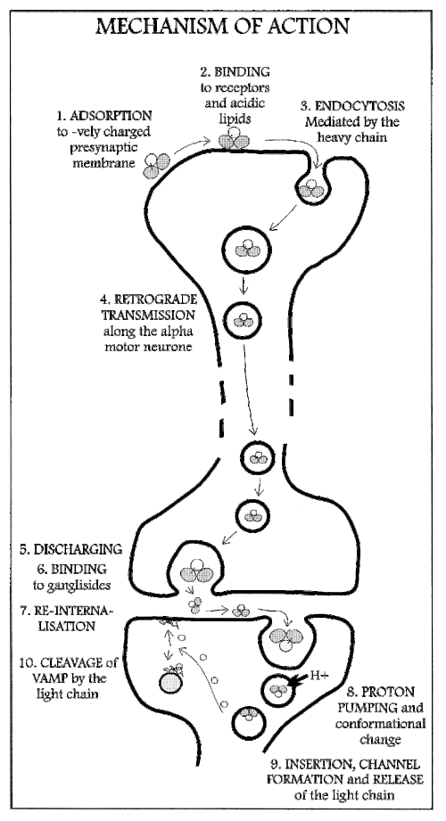 При инфицировании человека, тетанотоксин распространяется по лимфатической и кровеносной системам (не оказывая на них существенного влияния). Через нервно-мышечный синапс токсин попадает в аксон и далее по механизму ретроградного транспорта с участием моторных белков динеинов поступает в центральную нервную систему[3][4]. Там он блокирует высвобождение ГАМК и глицина (тормозных нейромедиаторов) из нервных окончаний путём расщепления синаптобревина[5] (белка, который осуществляет экзоцитоз везикул с нейромедиаторами в синаптическую щель). Токсин необратимо поражает нервные окончания[3], и функция нерва может восстановиться только путём образования новых терминалей и синапсов.