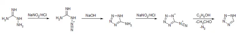 Препаративный метод синтеза тетразола — дезаминирование 5-аминотетразола, получаемого нитрозированием аминогуанидина с дальнейшей циклизацией образовавшегося азида, действием азотистой кислоты в спиртовом растворе[2][3]:
