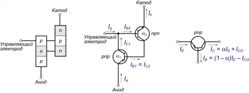 Для объяснения характеристик прибора в режиме прямого запирания используется двухтранзисторная модель. Тиристор можно рассматривать как соединение p-n-p транзистора с n-p-n транзистором, причём коллектор каждого из них соединён с базой другого, как показано на рис. 4 для триодного тиристора. Центральный p-n-переход действует как коллектор дырок, инжектируемых переходом J1, и электронов, инжектируемых переходом J3. Взаимосвязь между токами эмиттера , коллектора и базы и статическим коэффициентом усиления по току p-n-p транзистора также приведена на рис. 4, где — обратный ток насыщения перехода коллектор-база.