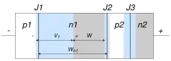 В режиме обратного запирания к аноду прибора приложено напряжение, отрицательное по отношению к катоду; переходы J1 и J3 смещены в обратном направлении, а переход J2 смещён в прямом (см. рис. 3). В этом случае большая часть приложенного напряжения падает на одном из переходов J1 или J3 (в зависимости от степени легирования различных областей). Пусть это будет переход J1. В зависимости от толщины Wn1 слоя n1 пробой вызывается лавинным умножением (толщина обеднённой области при пробое меньше Wn1) либо проколом (обеднённый слой распространяется на всю область n1, и происходит смыкание переходов J1 и J2).