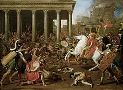 Взятие Иерусалима изобразил на одной из своих картин французский живописец XVII века Никола Пуссен. На этой картине, созданной в 1625 году для кардинала Франческо Барберини, Тит пытается предотвратить разрушение Храма. На заднем плане в храмовом портике кипит схватка; на переднем плане изображены с правой стороны скачущий на коне Тит, а с левой — римские солдаты, которые держат пленников. Все они обращены лицами к почти пустому центру композиции, где лежат расчленённые тела[129]. В XIX веке картину «Разрушение Иерусалима Титом» написал немецкий художник Вильгельм фон Каульбах (в 1841—1846 годах, по заказу короля Баварии Людвига I). В его изображении Тит является орудием божественного гнева; победу римлян празднуют ангелы и пророки[130]. Этот же сюжет использовали в своих картинах британец Дэвид Робертс (1850 год) и итальянец Франческо Айец (1867 год).