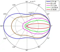 Зависимость дифференциального сечения рассеяния от угла рассеяния для различных значений энергий падающего фотона. Синим показана угловая зависимость для томсоновского рассеяния, т.е. для случая, когда энергия фотона мала по сравнению с массой электрона.