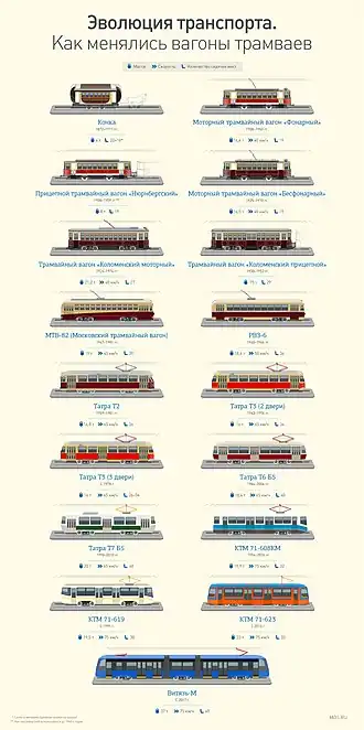 8. Описания и характеристики вагонов, использовавшихся и использующихся в Москве см. Московский трамвай. История. Подвижной состав. Архивная копия от 6 февраля 2006 на Wayback Machine