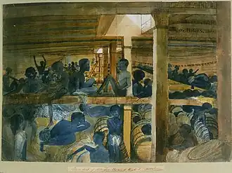 Для извлечения максимальной прибыли при пересечении океана рабы размещались в тесноте и антисанитарии, в результате чего, по оценкам, каждый шестой из них умирал по пути. При вспышках болезней или во время восстаний могло погибнуть до половины рабов[1]. Переход через Атлантику длился в среднем от 6 до 10 недель[7], всё это время рабы были скованы между собой цепями. Невольники испражнялись под себя, ели из общего ведра. Кормили рабов пищей, вызывающей запор. Из-за болезней, плохой пищи, качки многие погибали, мертвецов обнаруживали не сразу, часто уже разлагающимися, прикованными к живым людям. Трупы выбрасывали за борт акулам, сопровождавшим корабли рабовладельцев. Рабыни часто подвергались насилию и пьяным садистским оргиям[18].