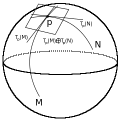 Два гладких подмногообразия и , вложенные в объемлющее пространство , пересекаются трансверсально в точке , если соответствующие касательные пространства и порождают всё касательное пространство объемлющего многообразия в точке , то есть .