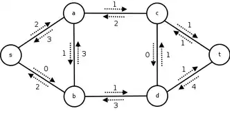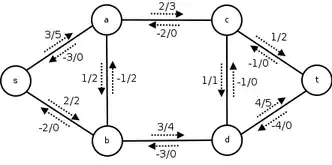 Ниже показана остаточная сеть для данного выше потока. Обратите внимание, что существует ограничивающая пропускная способность для некоторых рёбер, тогда как в исходной сети она равна нулю. Например, ребро . Этот поток не максимален. Есть увеличивающие пути , и . Остаточная пропускная способность первого пути . Увеличивающего пути не существует в исходной сети, но можно пропустить по нему правильный поток.