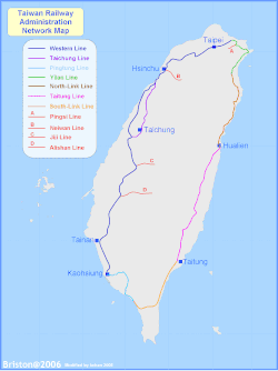 Все стандартные железные дороги страны (1097 км), управляются Администрацией тайваньских железных дорог (кит.трад. 臺灣鐵路管理局, сокр. TRA). Система включает в себя 4 основных линии, образующих замкнутый контур вокруг острова и 3 небольших дополнительных ответвления. Большая часть дорог электрифицирована, ширина колеи 1067 мм. Первая ветка была построена в 1891 г., во времена династии Цин.