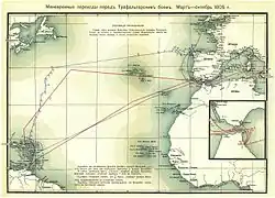 20 августа французская эскадра пришла в испанский порт Кадис, где её заблокировали британские корабли. 17 сентября 1805 года Наполеон послал Вильнёву приказ со всем союзным флотом сняться с якоря, идти к Картахене, чтобы там соединиться с испанским контр-адмиралом Сальседо, а оттуда — к Неаполю, чтобы высадить там войска, находившиеся при его эскадре, в подкрепление генералу Сен-Сиру, который должен был с севера вторгнуться в Неаполитанское королевство[2].