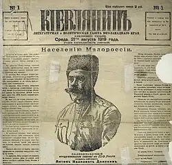 Публикация «Населению Малороссии» (1919) лидера Белого движения А. И. Деникина в газете В. В. Шульгина «Киевлянин» (№1), восстановленной с захватом Киева белыми