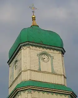Здание стоит на высоком кирпичном фундаменте в окружности 58 сажень, общей площадью 512 м2. Стены переходят прямо в башни-купола в 4-х ярусах, по три в линию, три ряда. Они связаны между собой так, что каждый служит опорой для соседних на основе равновесия, создав гармонию и красоту со всех сторон. Стены и башни-купола сложены из толстых дубовых и сосновых брусьев диаметром 40—45 см в «лапу» на деревянных шипах, без применения железных гвоздей. Средние башни-купола выше боковых, центральная из них выше средних, она высотой 35 м от земли. Купола окрашены в зелёный цвет. Снаружи все брусья-брёвна обшиты деревянными досками-шилевками, прикреплёнными железными гвоздями. Доски окрашены в белый цвет. Никаких поддерживающих колонн, никаких подпор и подставок как в середине, так и снаружи нет. С западной стороны к главному входу сделана каменная лестница, поставлен небольшой коридор. Такие же коридоры с лестницами имеются с южной и северной стороны здания.
