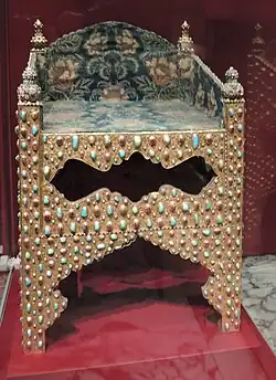 Трон — типичное восточное произведение искусства. Он имеет низкие спинку и подлокотники. Он имеет деревянную основу, оклеенную чеканными золотыми пластинами с тиснением по матрице (басмой) и канфарением. «В орнаментации использованы излюбленные на Востоке растительные мотивы, которые дополнены крупными камнями в высоких глухих кастах — голубой бирюзой, турмалинами и рубинами, также популярными в ювелирном деле Востока».