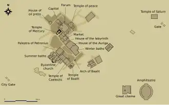 Среди уцелевших зданий выделяется Капитолий с колоннами коринфского ордера высотой 8,5 метров. Внимание на себя обращает храм Меркурия, имеющий круглую форму, а также две святыни, посвящённые Сатурну.