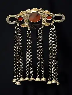 При изучении туркменских женских украшений, известный советский этнограф, доктор исторических наук Г. Васильева пришла к заключению, что общие черты таких украшений большинства туркменских племенных групп, манера их ношения свидетельствуют о единой этнической традиции туркменского народа. При исследовании находок археологов на территории Южного Туркменистана и смежных с ним областей V—VII вв. и IX—XIV вв., выявляется их большое сходство с украшениями современных туркмен[90]. Основываясь на этих данных, становится очевидным этническая преемственность и культурная непрерывность туркмен нынешнего времени с древним населением западной части Центральной Азии гуннского (IV—V вв. н. э.) и даже парфяно-кангюйского (более 2 тыс. лет назад) периодов[91]. На эту тему, известный туркменский историк М. Дурдыев пишет: